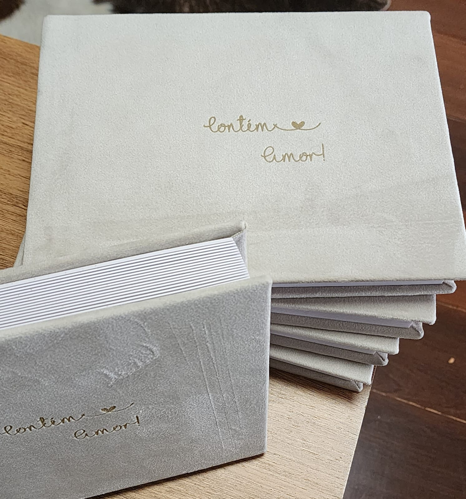 Capa em veludo com gravação a laser "contem amor" para colagem de fotos 10x15 ou 15x21.